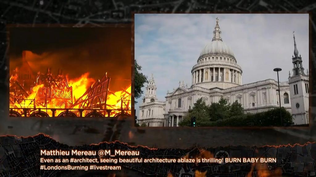 To mark the 350th anniversary of the Great Fire of London, artist David Best and Artichoke collaborated together to produce an 120-metre long sculpture of 17th-century London skyline, which was situated on the river Thames and set alight, in a dramatic re-enactment of this historic event. The project was broadcast live online and as the burn progressed, viewers watched whilst engaging with social media. Studio Three developed and operated the live graphics, integrating social media with the graphics and encouraging viewers to join the debate through call to action straps.